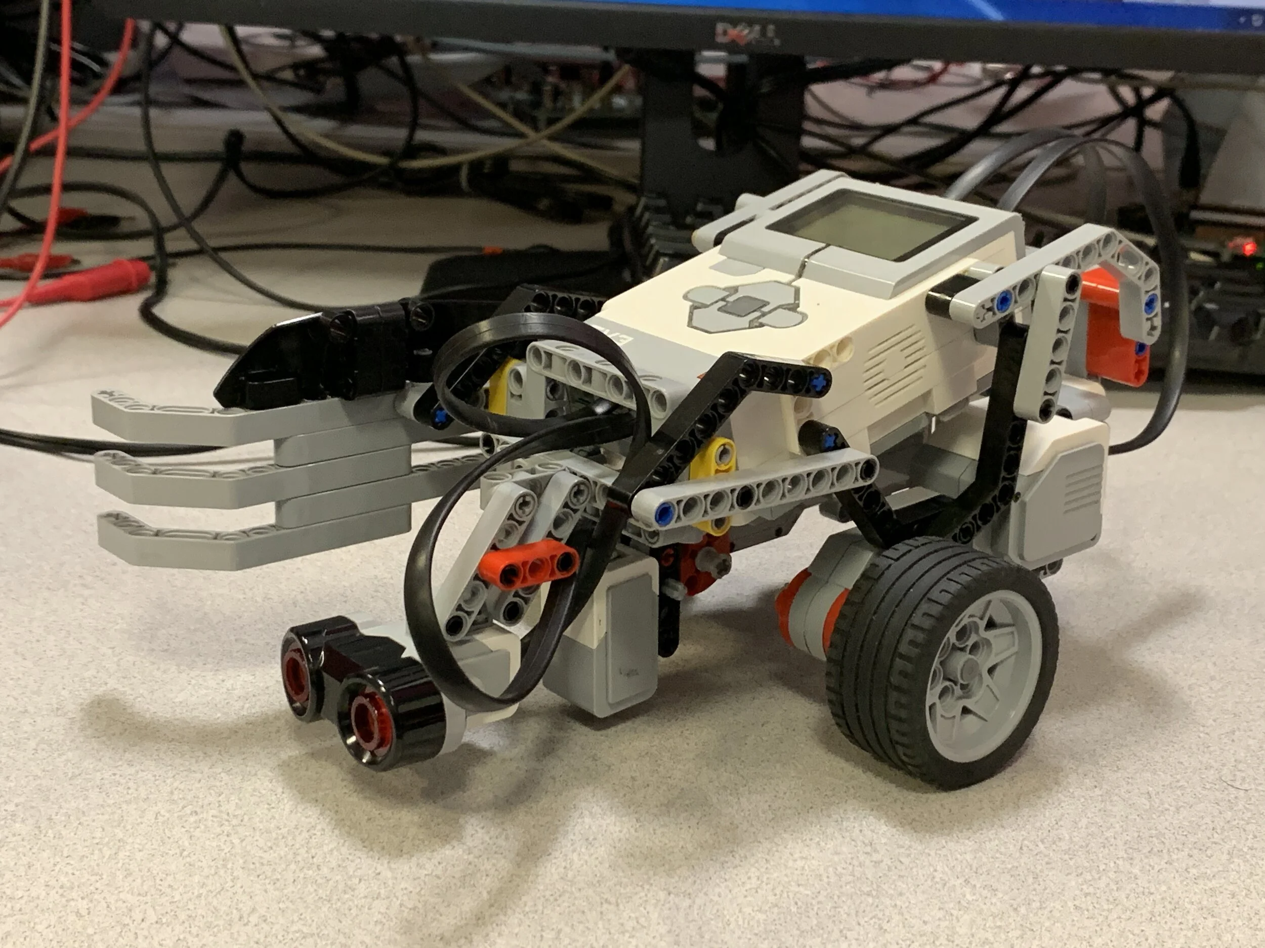As navigation relied on reacting to colour sensor data, the colour sensor had to be placed forward of the robot's pivot point. The farther the colour sensor was from the central pivot axis, the finer the rotational control- adversely, if the sensor were too far forward, the robot body could deviate too far from the path during tight turns. To balance speed and path accuracy, the sensor was placed close to the pivot point and instead relied on PID programming to optimize the speed.